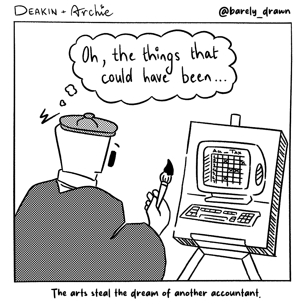 He was previously a part of Deakin’s Writers Club, having published several works (short stories, articles, poems, artworks) for their WORDLY magazine and website. He also has an Instagram account (@barely_drawn) where you may be able to find more D&A comics in the future.